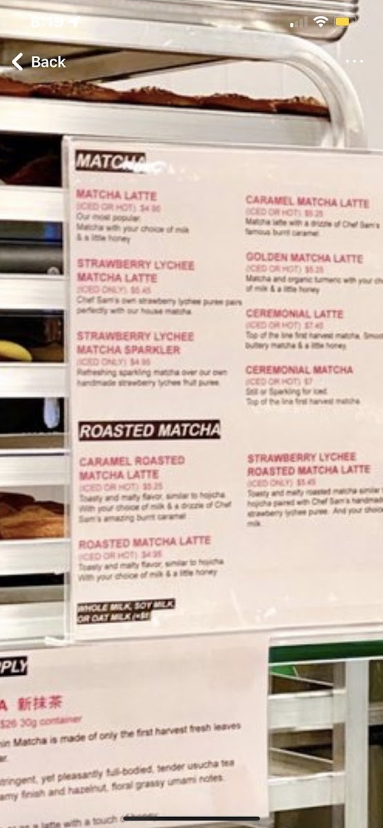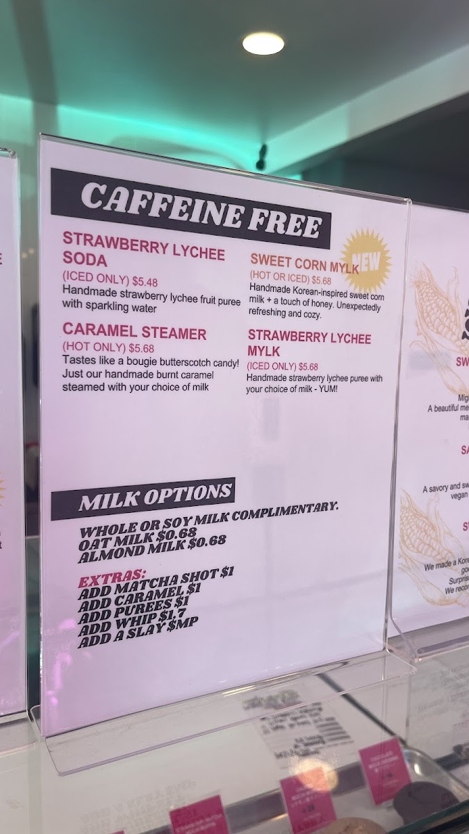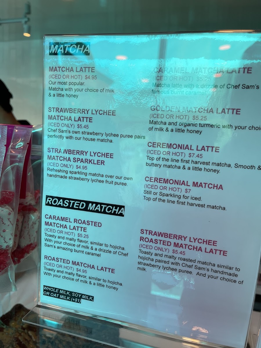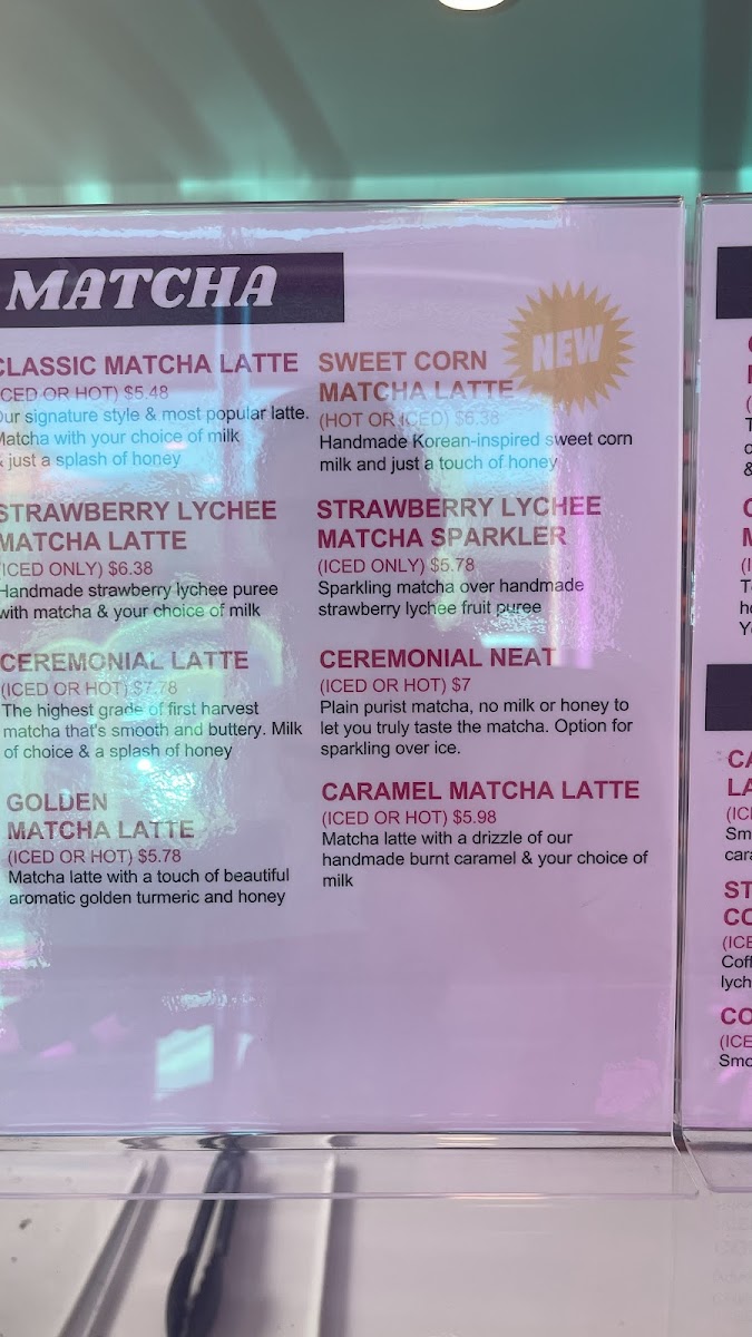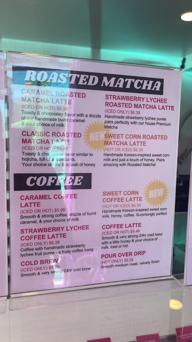 - Beverages: The drink offerings highlight specialty matcha lattes made from high-quality Uji matcha, including a turmeric-infused Golden Matcha Latte. Cold brew coffee options include fruity and flavored lattes like the Strawberry Lychee Cold Brew Latte and Caramel Cold Brew Latte, served iced with a choice of milk.