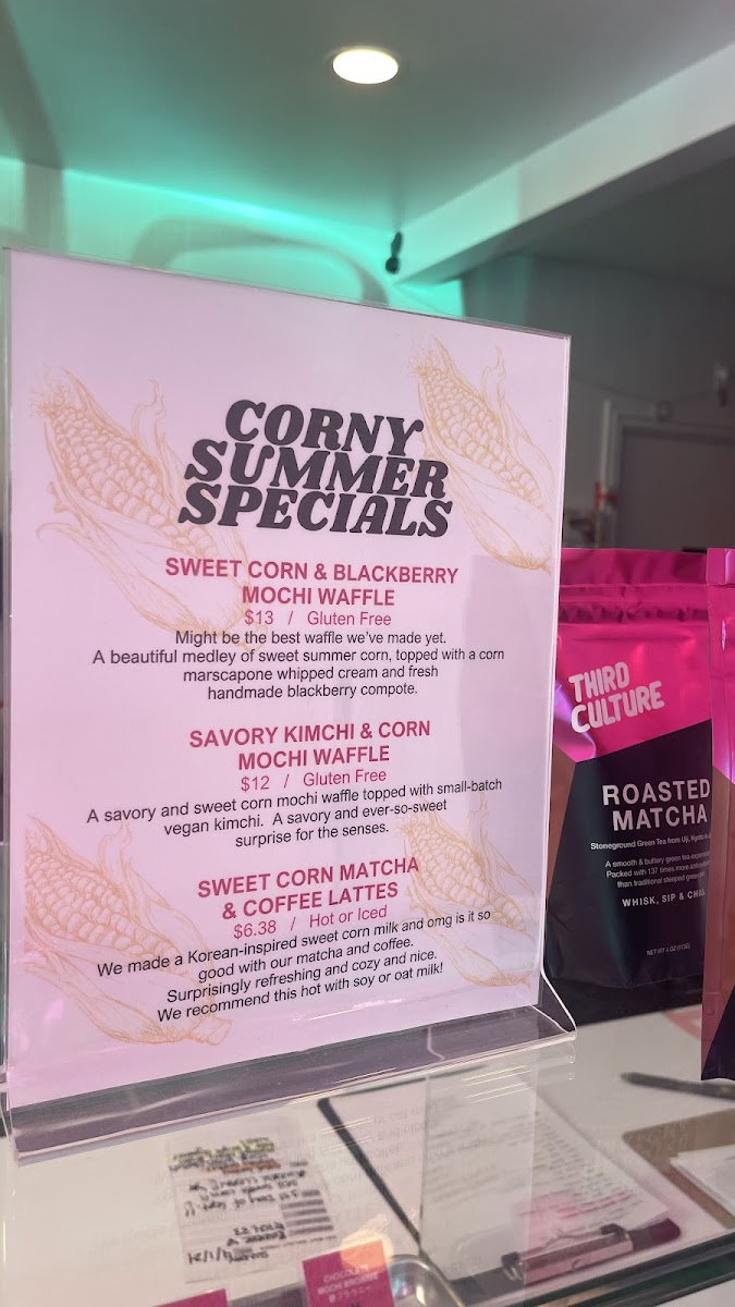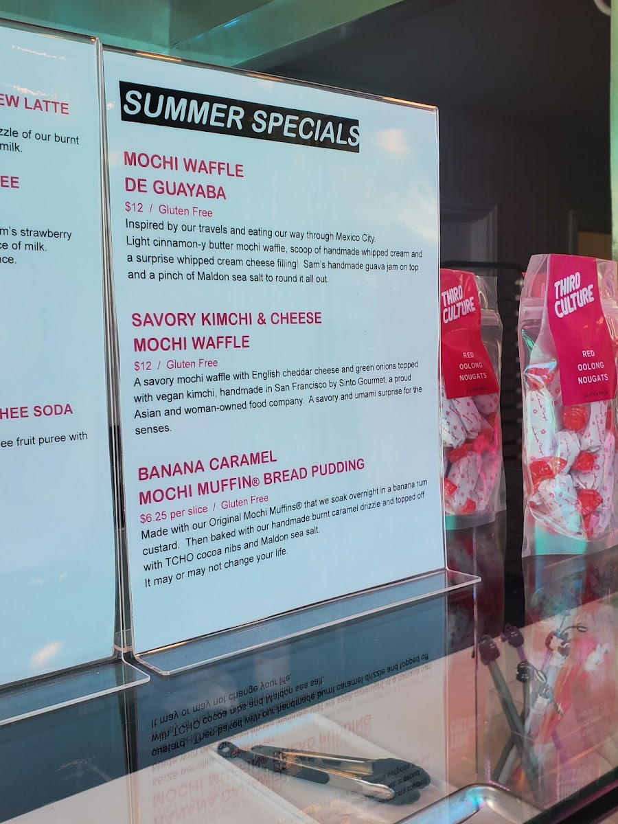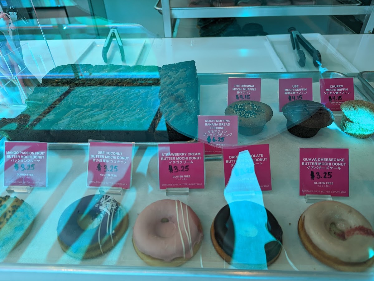 - Bakery Treats: This section features the Half Dozen Variety Butter Mochi Donuts with rotating flavors like Dark Chocolate, Matcha, Mango Passion Fruit, and Ube Coconut. Additional items include mochi muffins in flavors such as Ube and banana, as well as mochi bread pudding and kimchi cheese mochi waffles, combining traditional and innovative bakery approaches.