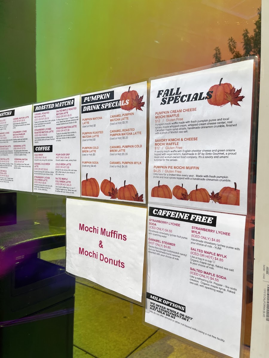 This menu is suited for breakfast, light meals, or coffee breaks, providing quick-order bakery items and handcrafted beverages. Visitors typically select from freshly baked mochi treats and complement them with tea or coffee-based drinks.